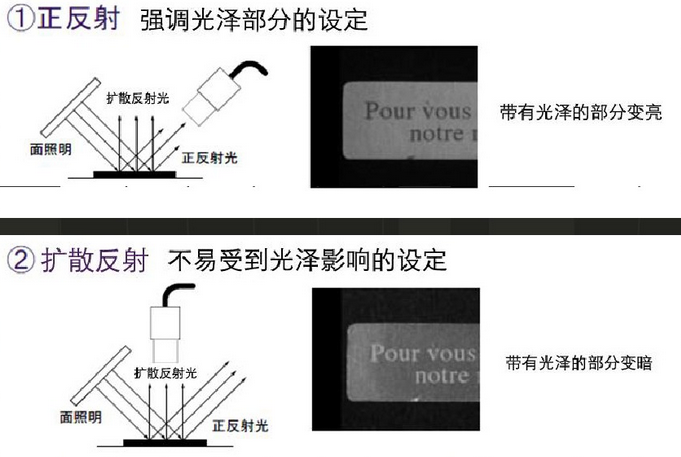 將相機(jī)設(shè)置在法線的線路上,這樣成像,工件帶有光澤的部分與正反射相比會變暗。擴(kuò)散反射不易受工件光澤度影響。