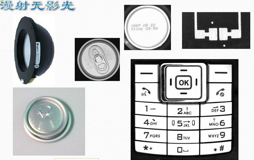 ?通過特殊形式的結(jié)構(gòu)和漫反射原理,達到照射的產(chǎn)品無影化,從而達到理想的成像,圖像為無影燈進行瓶蓋標(biāo)碼,易拉罐瓶以及手機鍵盤的檢查。