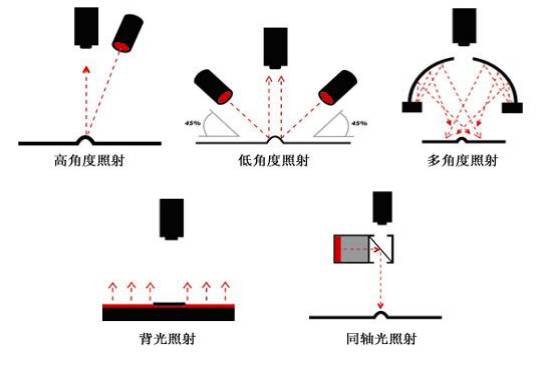 根據(jù)期望的圖像效果,選擇不同入射角度的光源。高角度照射,圖像整體較亮,適合表面不反光物體;低角度照射,圖像背景為黑,特征為白,可以突出被測物輪廓及表面凹凸變化;多角度照射,圖像整體效果較柔和,適合曲面物體檢測;背光照射,圖像效果為黑白分明的被測物輪廓,常用于尺寸測量;同軸光照射,圖像效果為明亮背景上的黑色特征,用于反光厲害的平面物體檢測。不同角度光源的示意圖如下:???