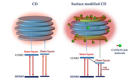 最近幾年,針對(duì)實(shí)現(xiàn)高效近紅外發(fā)光的難題,曲松楠課題組通過對(duì)紅光碳納米點(diǎn)表面進(jìn)行吸電子基團(tuán)修飾及對(duì)碳基內(nèi)核層有序結(jié)構(gòu)的無序化調(diào)控,在近紅外波段產(chǎn)生新的發(fā)光帶隙,獲得了在近紅外光激發(fā)下具有高效近紅外發(fā)射的碳納米點(diǎn),熒光量子效率達(dá)到10%,為國(guó)際最高值。