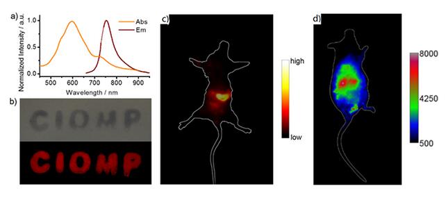 ???圖2. (a)碳納米點(diǎn)@PVP復(fù)合物的吸收、發(fā)射光譜。(b-d)以碳納米點(diǎn)@PVP復(fù)合物為成像試劑的近紅外熒光成像(b)和小鼠胃部(c)及尾靜脈注射后血液循環(huán)過程中的活體近紅外熒光成像(d)。