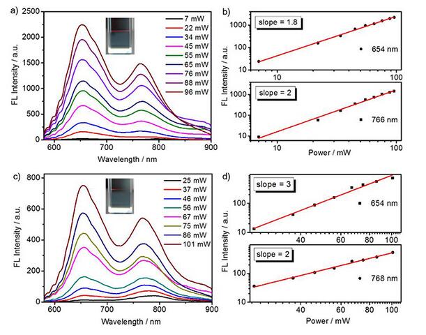 ???圖3. 近紅外-Ⅱ區(qū)飛秒光激發(fā)碳納米點(diǎn)的多光子誘導(dǎo)發(fā)光。(a-b)1200 nm飛秒光激發(fā)碳納米點(diǎn)的發(fā)射光譜和發(fā)光強(qiáng)度-激發(fā)光功率曲線,(c-d)1400 nm飛秒光激發(fā)碳納米點(diǎn)的發(fā)射光譜和發(fā)光強(qiáng)度-激發(fā)光功率曲線。